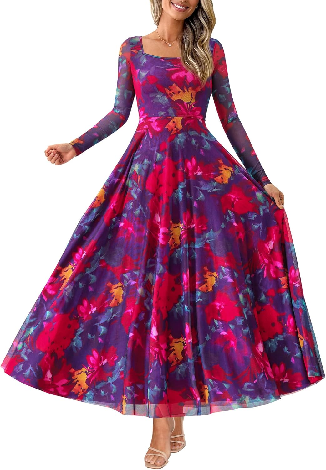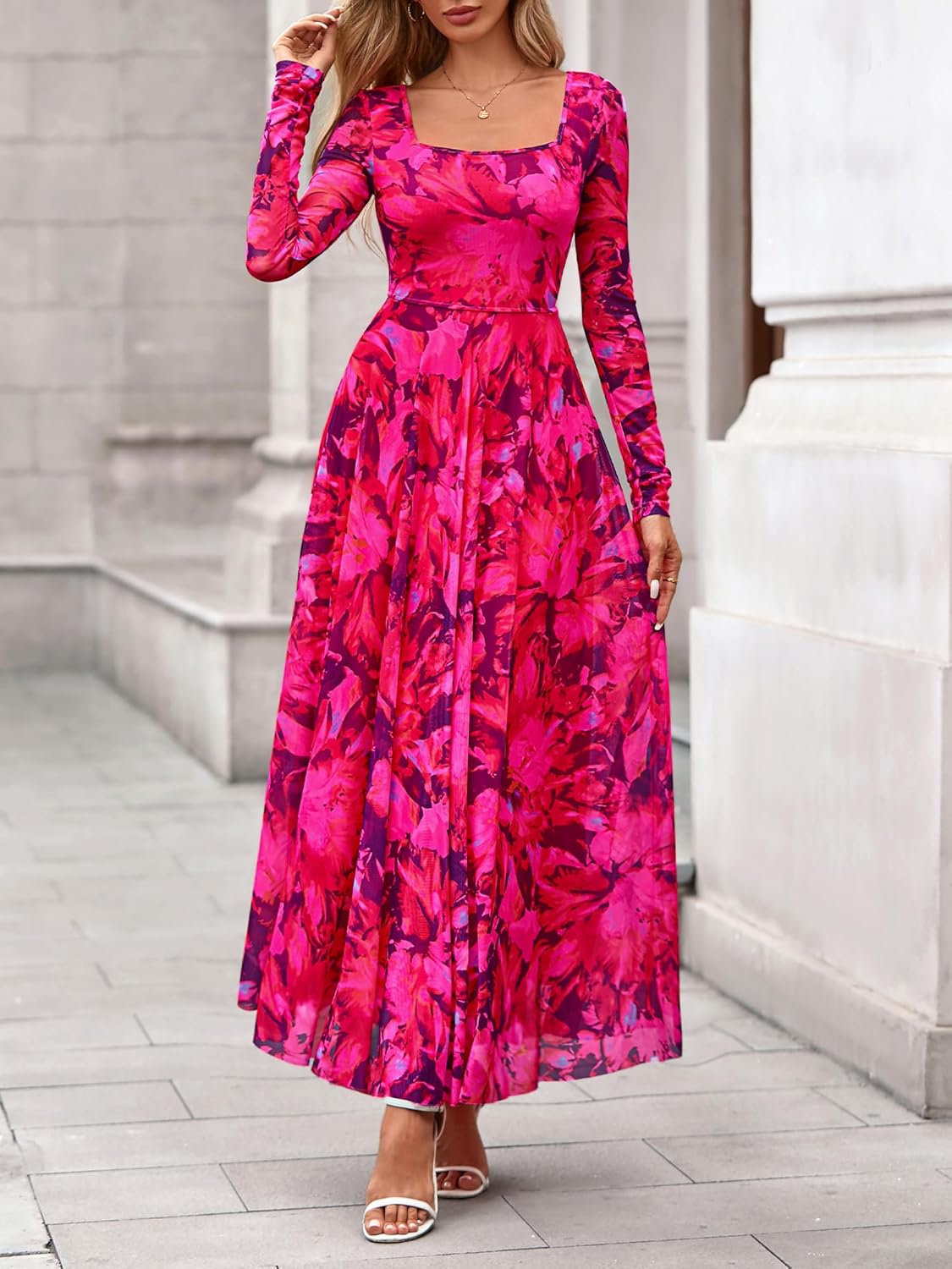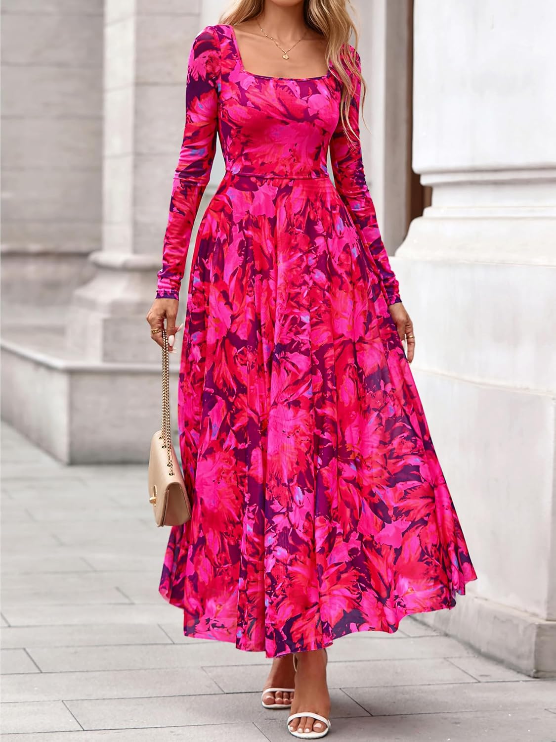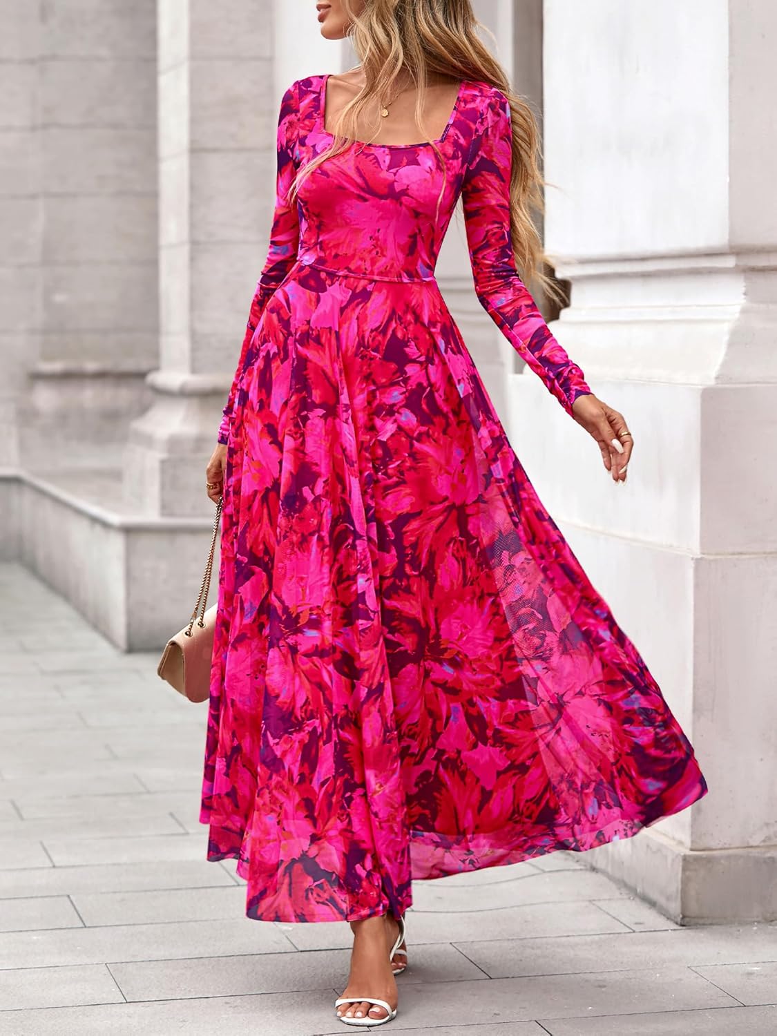 BTFBM Women Maxi Dress Fall 2025 Fashion Elegant Long Sleeve Square Neck Floral Print Party Club Wedding Guest Dresses