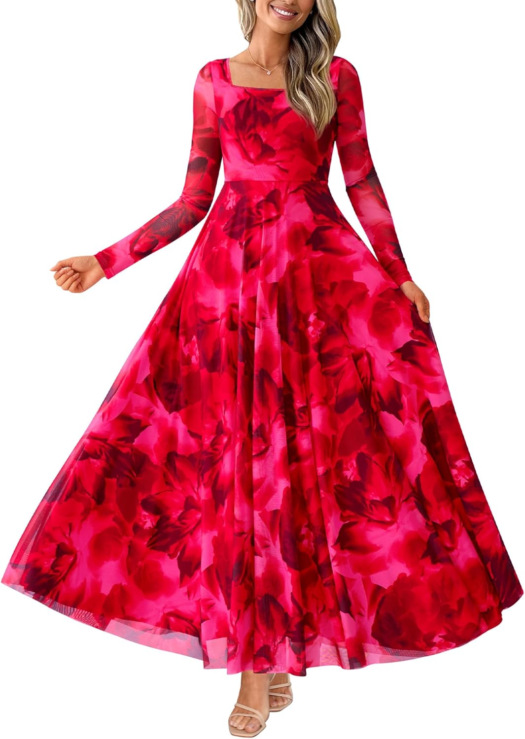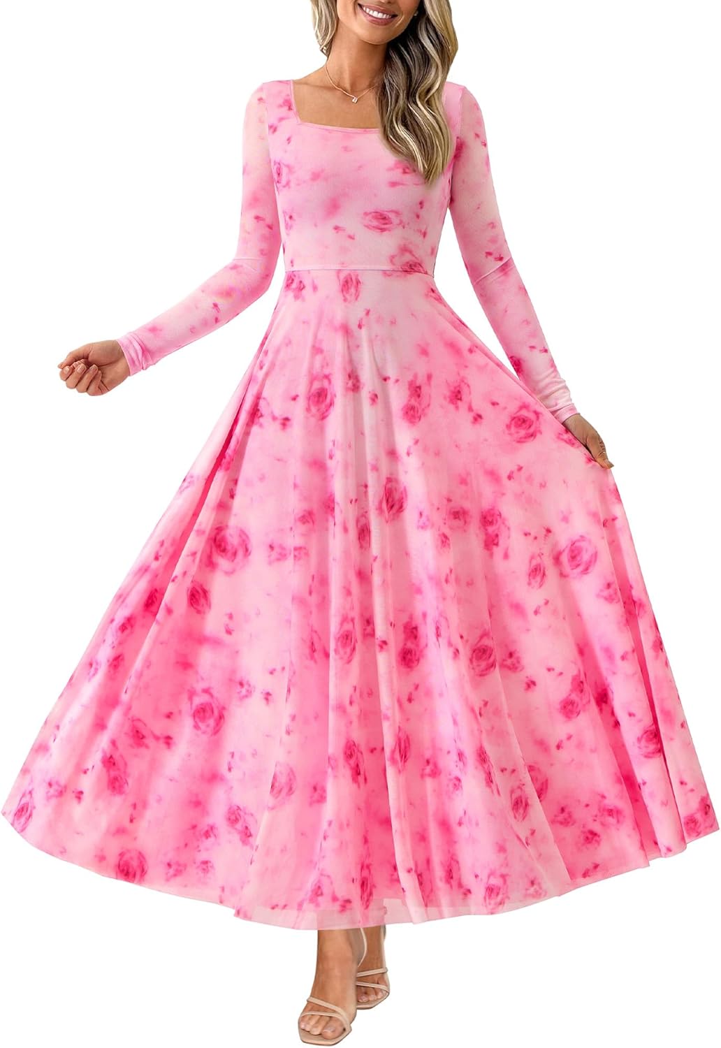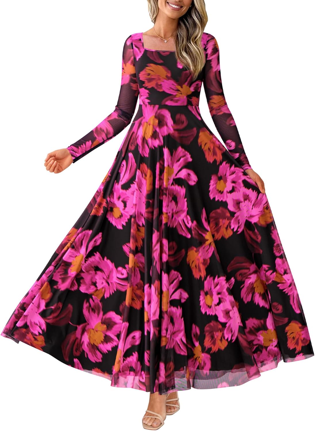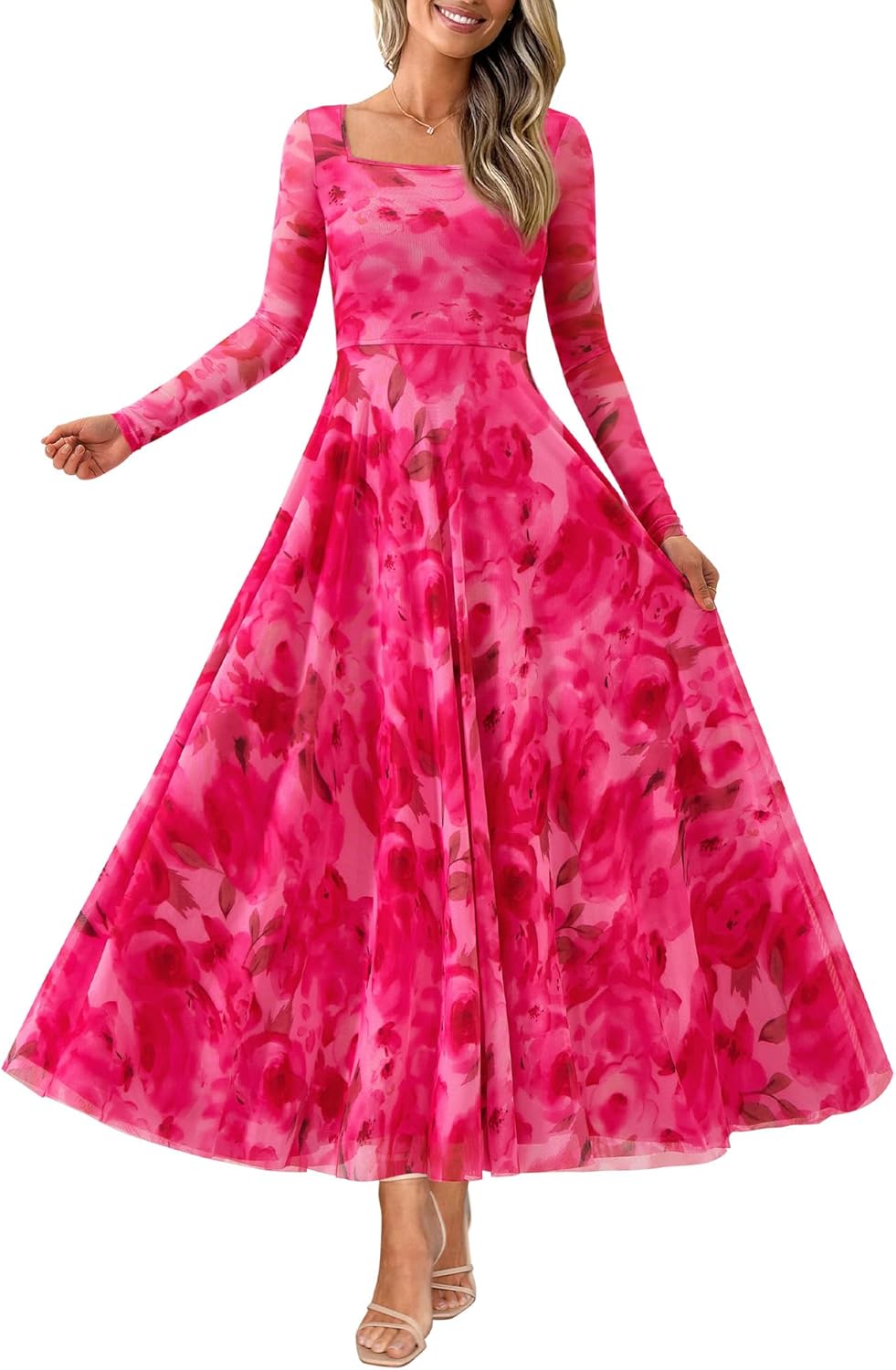 BTFBM Women Maxi Dress Fall 2025 Fashion Elegant Long Sleeve Square Neck Floral Print Party Club Wedding Guest Dresses
