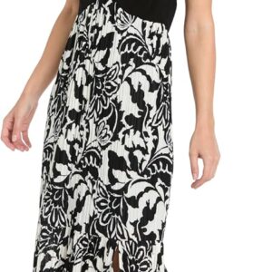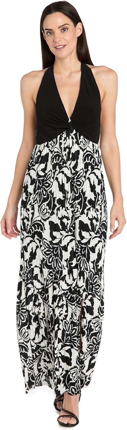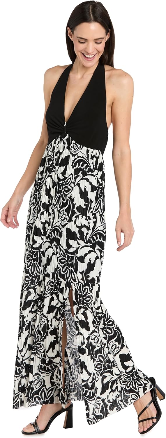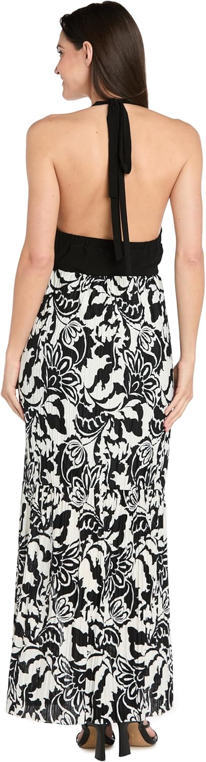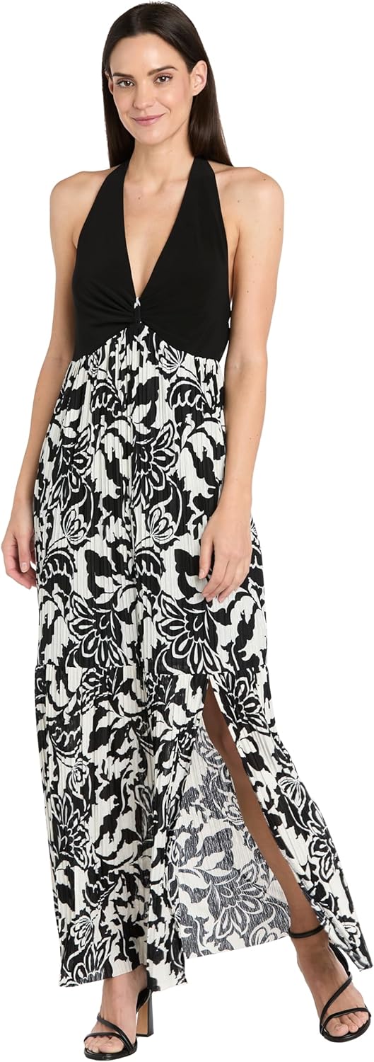 Channel effortless elegance with this comfy, casual halter dress, a maxi-length beauty that balances bold contrast with timeless femininity. The sleek black halter top offers a plunging neckline and open back that flatters from every angle, while the ivory pleated skirt comes to life in a rich floral print. A side slit adds movement and ease, perfect for sunny escapes, festive gatherings or romantic evenings. Whether you’re barefoot on the beach or dressed up under city lights, this dress moves with you and makes an unforgettable impression.