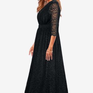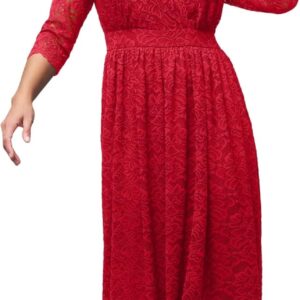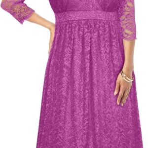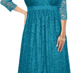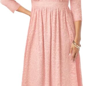 A universally flattering A-Line fit is made even more special with elegant, easy-care lace. The bodice is lined and shaped with a banded waist. Scalloped edges on the surplice neckline and the sheer sleeves add the perfect feminine touches. This entrance-making dress is so comfortable, you can dance the night away. V-Neck br> A-Line Silhouette br> Three-quarter sleeves br> Banded waist br> Stretch lining br> 55” length br> Nylon/spandex br> Machine washable br> Imported