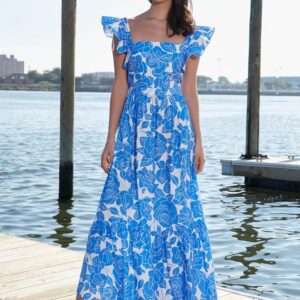 - This summer dress features front and back square necks, adding a touch of elegance to your look. The ruffle detail along the sleeveless armholes waistband, and the maxi length skirt with a hem tier enhances its charm.