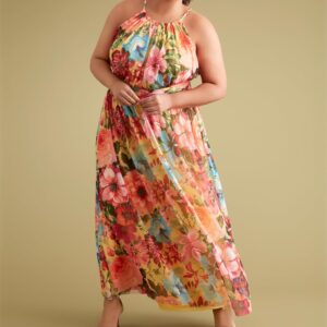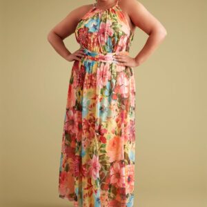 - Sleeveless floral print maxi dress featuring a gathered halter neckline, fitted bodice, and flowy, pleated skirt with a cinched waistline; this summer dress, long dress, and halter dress is perfect for any occasion.