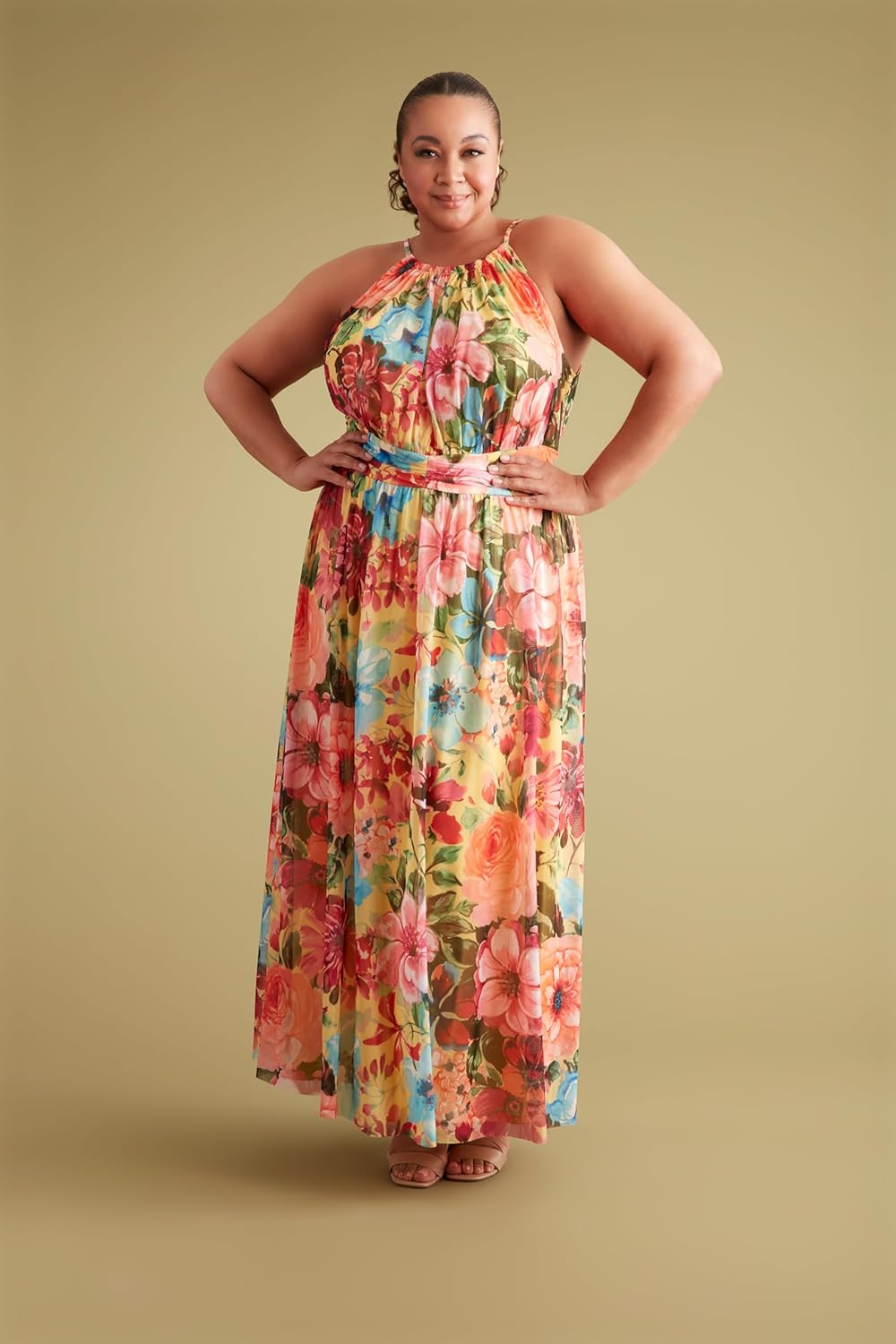 Mesh Halter Maxi with Ruched Waistband Event Guest Of Occasion Garden Party,