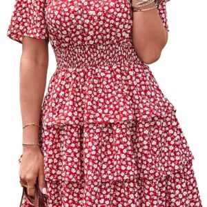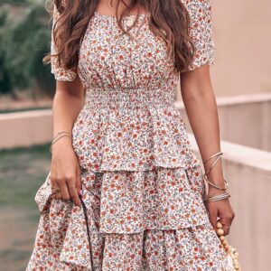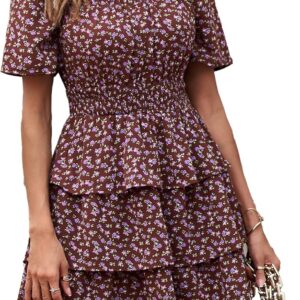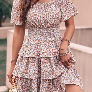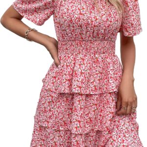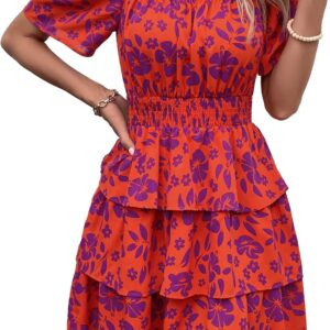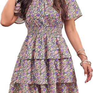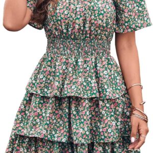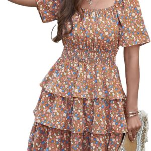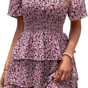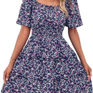 PRETTYGARDEN Women’s 2025 Floral Summer Short Dress Square Neck Short Sleeve Tiered Ruffle Boho Swing Dresses